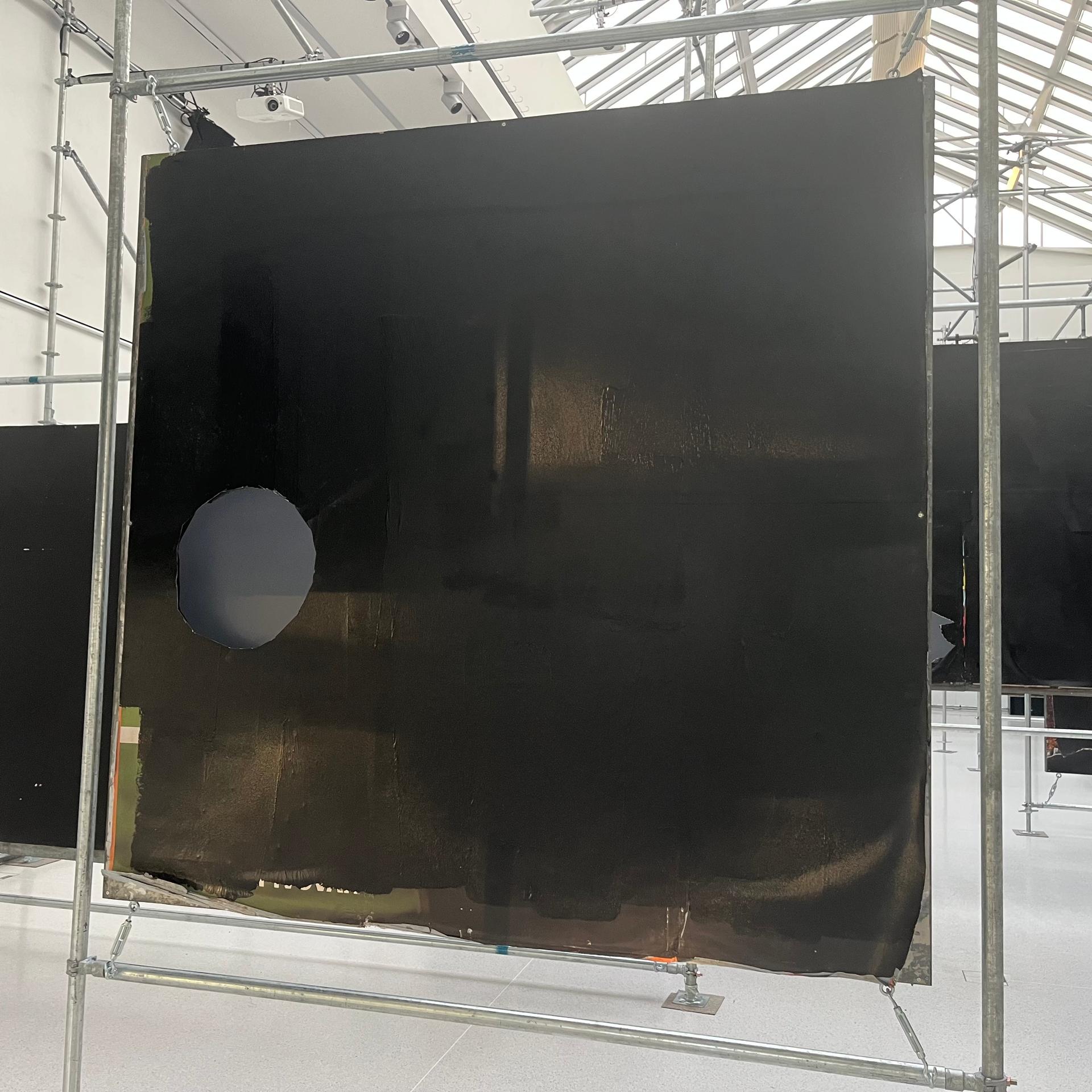 Těsně před šestou hodinou večerní se galerie pomalu noří do tmy. Centrální výstavní sál je zaplněn lešenářskými trubkami, na kterých visí šestnáct podlouhlých objektů. Z jedné strany je tvoří ocelové desky polepené papíry, jež jsou přetřené černým asfaltem. Stejnou barvu má i opačná strana desek, na níž jsou připevněná plátna natažená na dřevěné rámy.