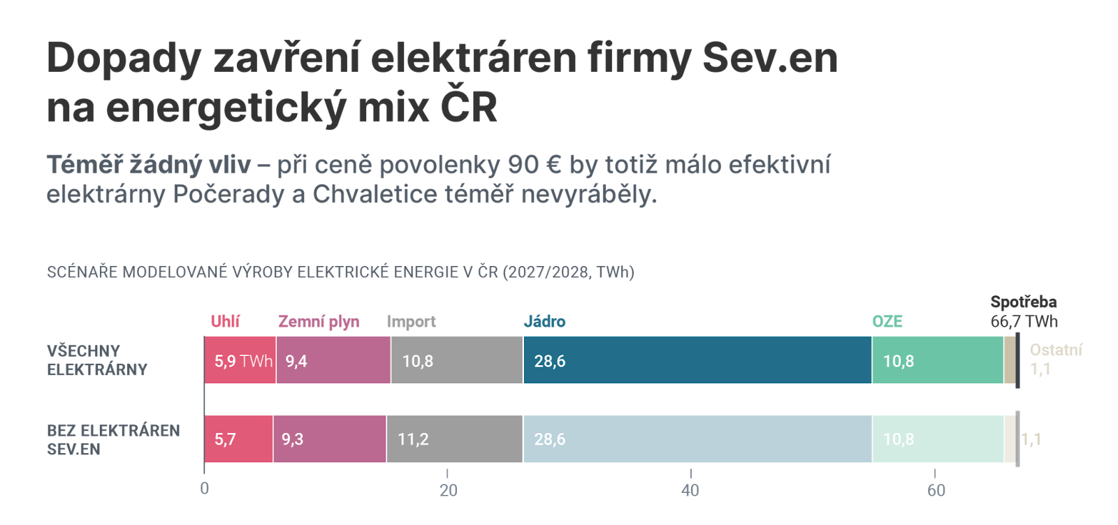 Na sklonku loňského roku oznámila firma Sev.en Pavla Tykače plán ukončit hnědouhelných elektráren Chvaletice, Počerady a teplárny Kladno, jejichž provoz se přestává vyplácet. Nová analýza organizace Fakta o klimatu ukazuje, že vypnutí uvedených elektráren by nemělo v Česku ohrozit dodávky elektřiny a na její ceně by se mělo podepsat jen minimálně. Vyplynulo to z modelování české a evropské energetické soustavy.