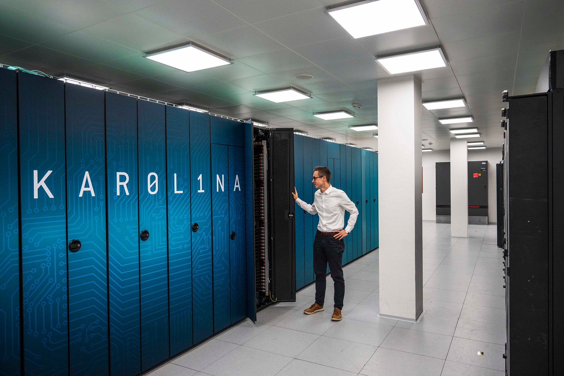 Karolina se nachází v IT4Innovations, národním superpočítačovém centru při Vysoké škole báňské – Technické univerzitě v Ostravě, jež se zabývá hlavně vědeckými výpočty. Pobyt uvnitř tohoto stroje má ovšem blízko k tomu, co by spatřil návštěvník, který by fyzicky vstoupil do „mozku“ současné umělé inteligence vyvinuté soukromými firmami, jakou představuje třeba populární jazykový model ChatGPT společnosti OpenAI. Ovšem až na rozměry – ty jsou u Karoliny stále spíše trpasličí. Hardware, na němž po dokončení tréninku běží velcí chatboti, může být rozptýlen ve více datových centrech, jinak řečeno v mnoha rozlehlých budovách připomínajících svým vzhledem sklady či tovární haly plné skříní s počítačovým vybavením.