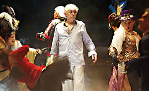 Tajemník Hanuš (Jiří Lábus) pendluje mezi vilou a kůlnou a odděluje erární věci od věcí soukromých, tvrdíkovsky úlisný poradce Viktor (Oldřich Kaiser) jako by měl zase předepsanou možnost pohybu jen mezi kůlnou a stolem, místo u stolu je vyhrazené matce (Vlasta Chramostová) a samozřejmě Riegerově „dlouholeté přítelkyni“ Ireně (Dagmar Havlová). Sluha Osvald (Stanislav Zindulka) neustále zakopává o jediný kámen široko daleko, všichni návštěvníci se musejí popasovat s louží na přístupové cestě.