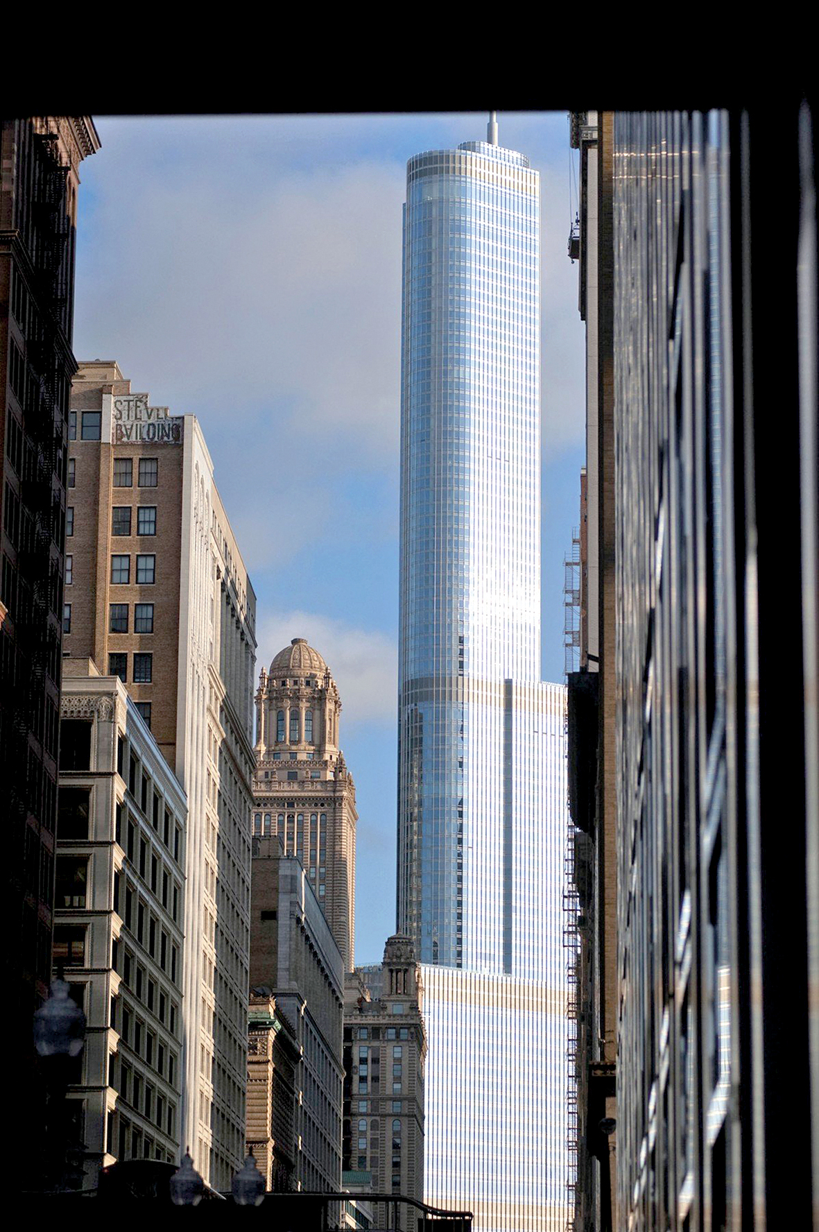 Devadesát osm pater elegantní věže se tyčí do úctyhodných 423 metrů. Trump představil projekt této stavby v roce 2001 s tím, že půjde o nejvyšší budovu na světě. Záhy nato přišlo 11. září a realitní magnát se z obavy před teroristy rozhodl ubrat poslední část plánovaného domu. Nedaleko od něj ale stojí Sears (Willis) Tower, která skutečně byla po čtvrt století nejvyšší budovou světa. A vedle nich další a další, celý les mrakodrapů, včetně těch úplně nejstarších na světě.