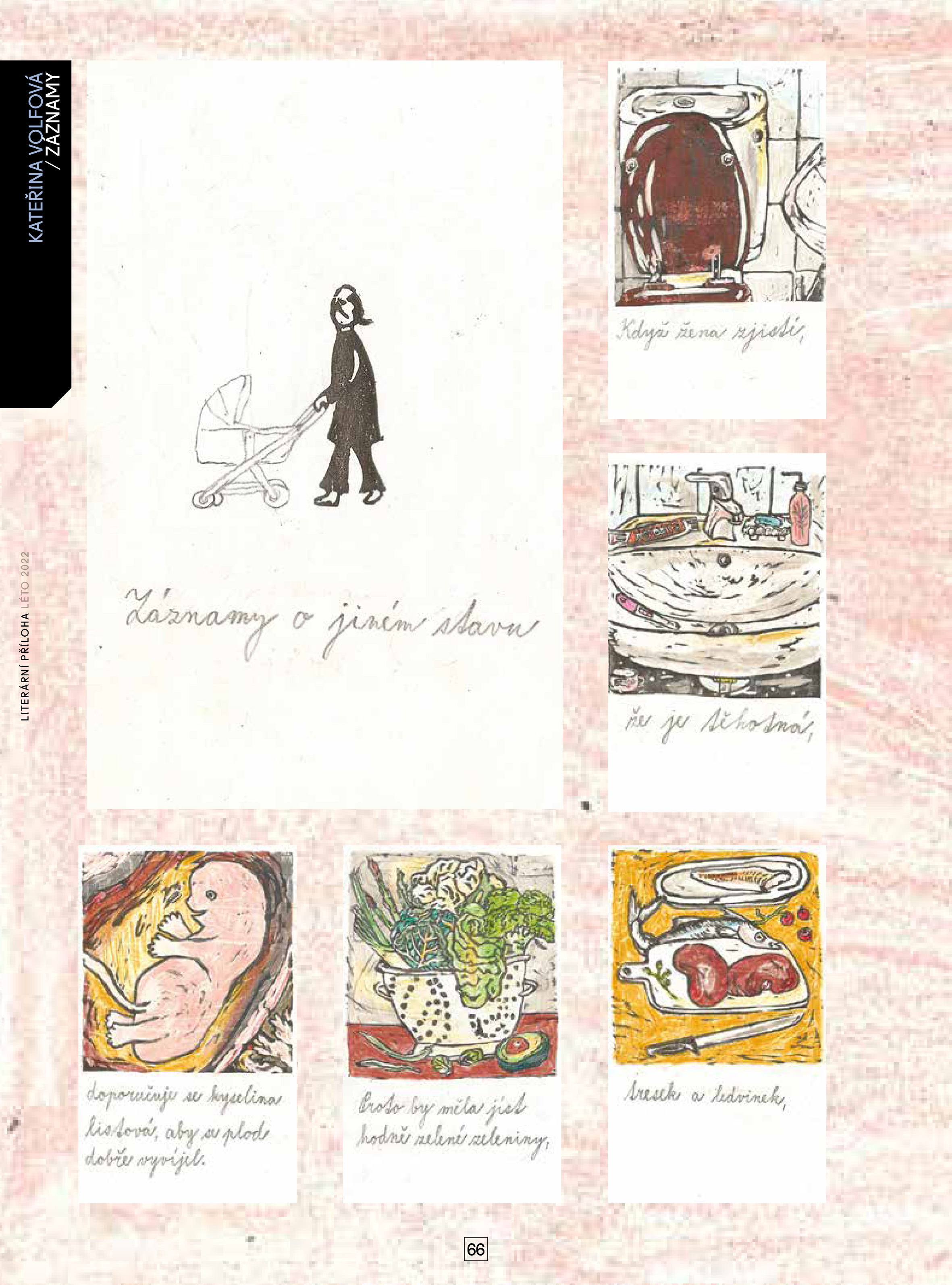 Táborská rodačka vystudovala ateliér ilustrace a grafiky Juraje Horvátha na pražské UMPRUM. Zabývá se vyšívanými obrazy, malováním a kreslením. Její série Záznamy, z níž zde publikujeme ukázku, vznikla jako diplomová práce v podobě linorytů kolorovaných pastelkami. Sešitky s historkami z autorčina života vyjdou letos v knižní podobě v nakladatelství Xao.