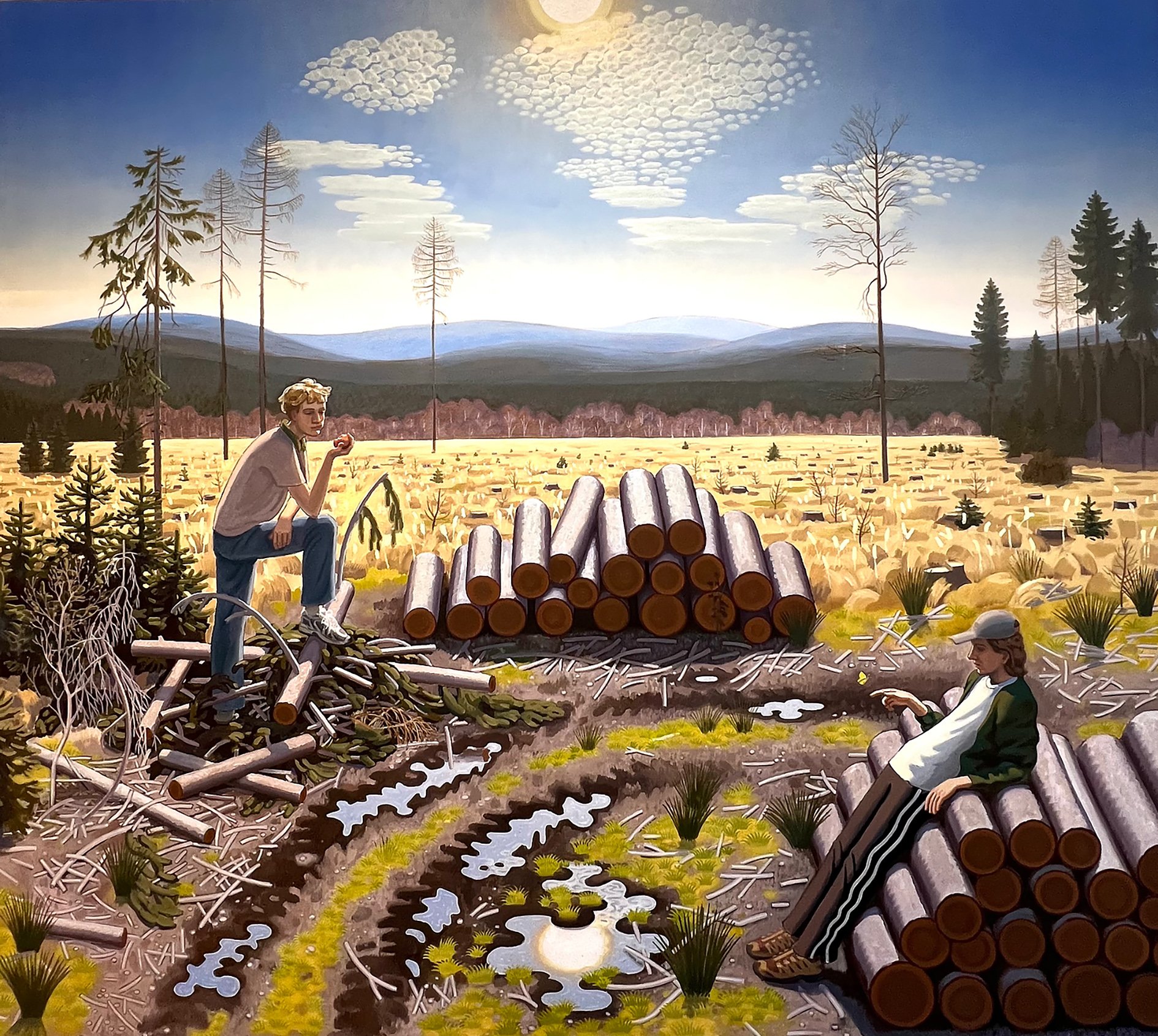 Také Jan Kostohryz (32) pracuje na AVU, s Robertem Šalandou vede ateliér Malba 1. Puntičkářsky přesný malíř je známý tím, že obrazů nedělá moc, a tohle je příležitost vidět hned dva nové. Obě velkoformátová plátna věnoval kůrovcům. Na jednom oleji vidíme spoušť, kterou po sobě brouci zanechali na dříve zalesněném kopci, po kterém kráčejí dva houbaři. Na druhém odpočívají dva mladíci vedle metrovek dřeva nařezaných lesníky, kteří se horskou kalamitu pokusili komodifikovat. V centru Kostohryzovy pozornosti zůstává, co je pro něj typické: drobné interakce lidí s jejich okolím, v případě mladíků se svačinkovým jablkem, respektive motýlem vznášejícím se druhému nad prstem.