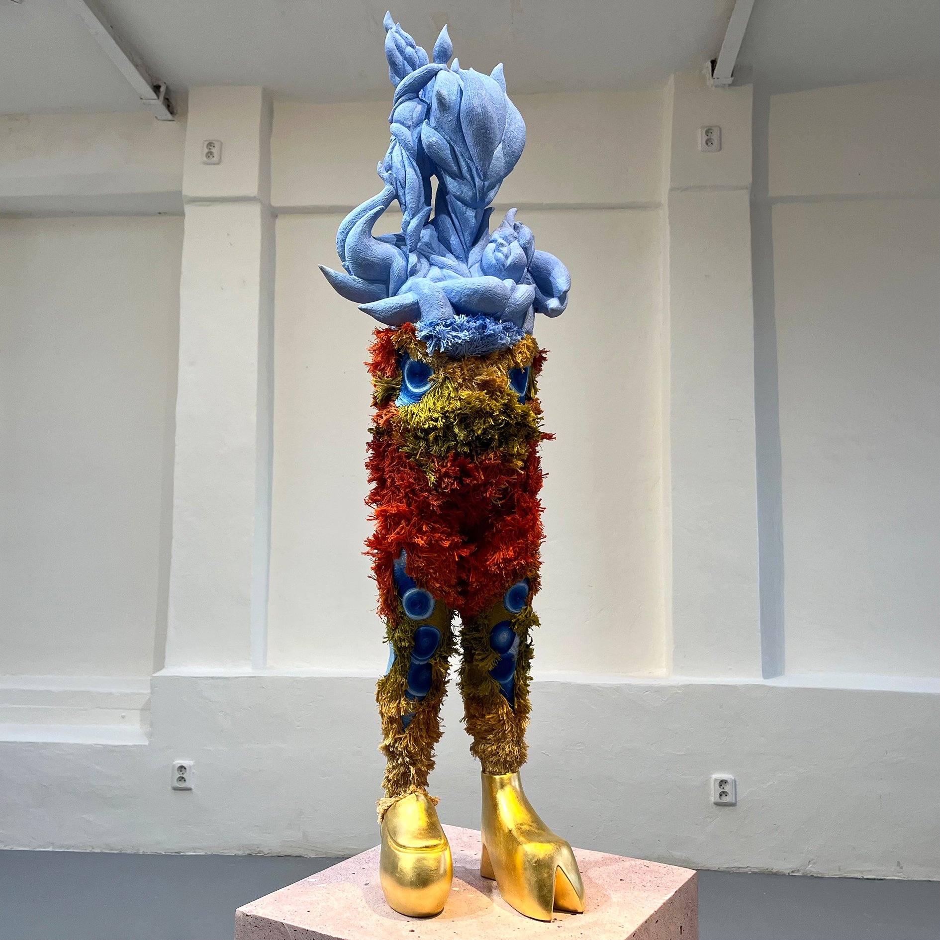 Většina z nových soch má vročení 2024–2026. Roztočilová se každé skulptuře věnuje tak dlouho už kvůli náročné technice, kdy epoxid kombinuje s keramikou a textilem – jako zkušená malířka zároveň dbá na vyváženou barevnost objektů. Nejde však samozřejmě jen o formu, ale hlavně o obsah. V aktuální sérii rozpracovává svou zkušenost s mateřstvím. Půvabné Annino rozhodnutí má podobu skřítkovité postavy s modrým vrškem připomínajícím pučící květ, jeho střední část hustě pokrývají vlákna vyšívací příze složená do tvaru motýlího či snad pavího maskování, nohy má tato pitoreskní figura navlečené do zlatých střevíčků. Podobně koncipovaná je Chlupatá svoboda, akorát je celá zelená. Vrcholem výstavy je pak dva metry vysoký Tvar trifida. Tvoří ho rudé – kupodivu hned čtyři – nohy obkroužené dlouhými copy, jež společně podpírají jakousi arcimboldovskou tvář. Jako by vypadla z dílny odvážného pekaře či uzenáře vyznačujícího se ve skládání potravinářských produktů nespoutanou fantazií.